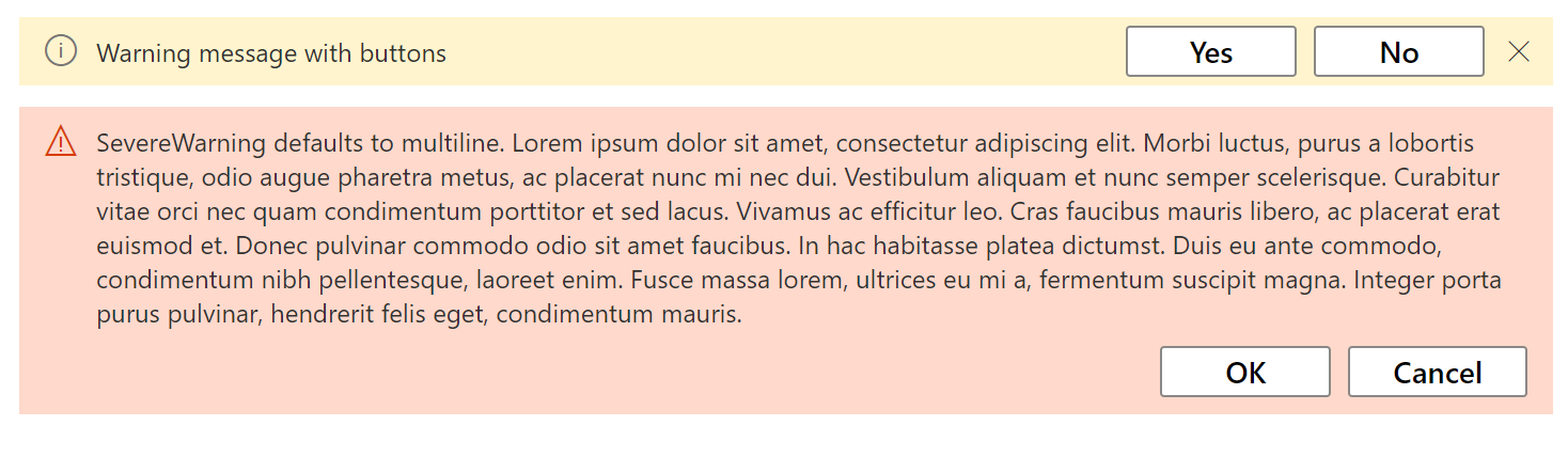 Message(type='severeWarning', multiline=True, value='SevereWarning defaults to multiline. Lorem ipsum dolor sit amet, consectetur adipiscing elit. Morbi luctus, purus a lobortis tristique, odio augue pharetra metus, ac placerat nunc mi nec dui. Vestibulum aliquam et nunc semper scelerisque. Curabitur vitae orci nec quam condimentum porttitor et sed lacus. Vivamus ac efficitur leo. Cras faucibus mauris libero, ac placerat erat euismod et. Donec pulvinar commodo odio sit amet faucibus. In hac habitasse platea dictumst. Duis eu ante commodo, condimentum nibh pellentesque, laoreet enim. Fusce massa lorem, ultrices eu mi a, fermentum suscipit magna. Integer porta purus pulvinar, hendrerit felis eget, condimentum mauris.', buttons=[